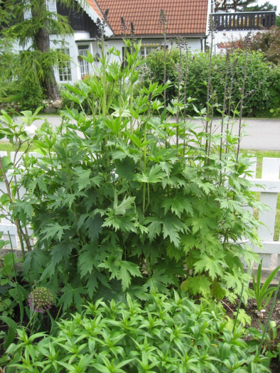 Riddersporen står like rank etter all den vinden som har vært. Jeg er sikker på at den gleder seg ellevilt til å springe ut i full blomst