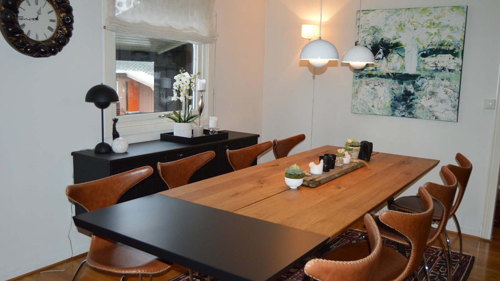 Vi har valgt å ta inn litt mer svart i stua, og hva passer vel bedre enn å ha svarte illeggsplater på hver side av bordet. Jeg synes det er fint med noen kontraster.