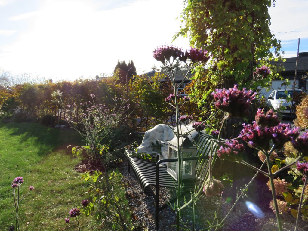 Jeg flyttet hagebenken til dette gruslagte området for noen uker siden, og her skal den få stå gjennom vinteren. Da blir den ikke så våt på beina, for i gresset er det fuktig hele døgnet i denne årstiden.