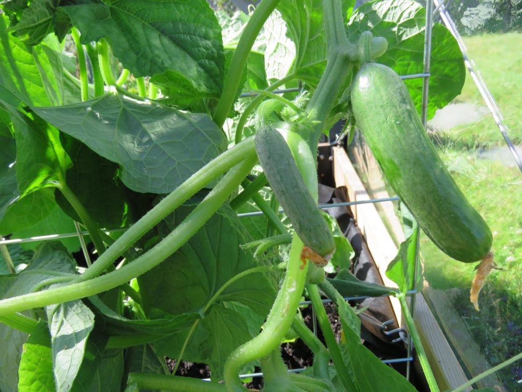 Små slangagurker som venter på å bli plukket og spist. Det er faktisk første året jeg prøver meg på den grønnsaken.