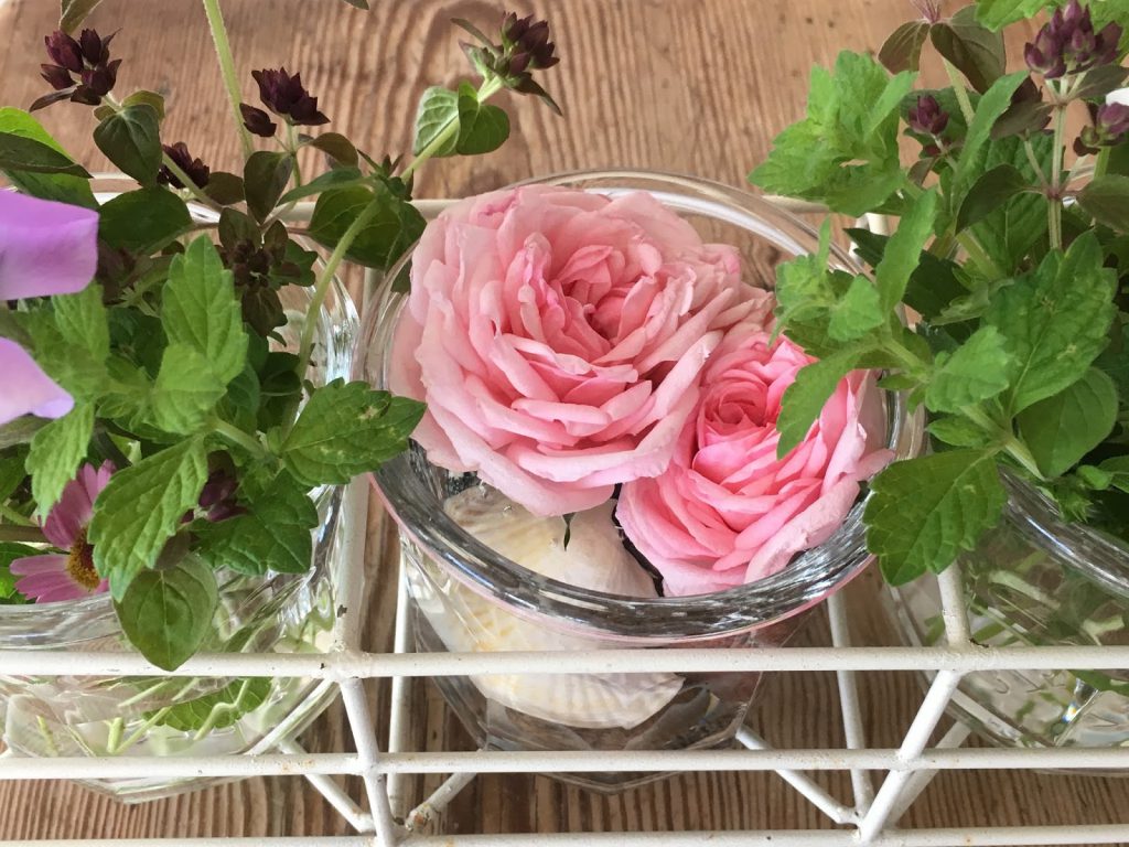 Når jeg skulle knipe av roser som var kommet langt, sa 7 åringen vi har besøk av at hun ville ha dem. Hun plasserte dem på bordet på hytteverandaen. Det ble jo så fint, hun har jammen pynteteft, spør du meg.