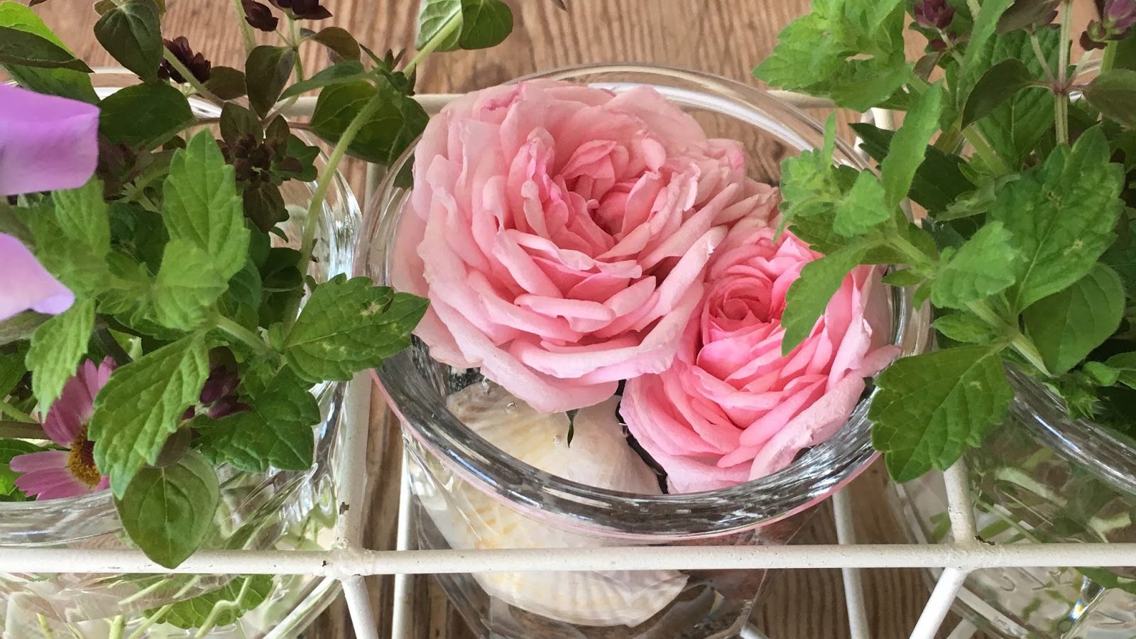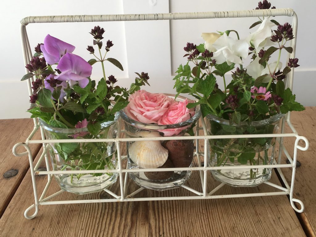 Roser og sommerfølelse: Når vi ønsker å pynte litt i hytta, skal det ikke mer til enn å plukke inn noen roser og andre sommerblomster fra hyttehagen, eller rettere sagt fra blomsterkrukkene.
