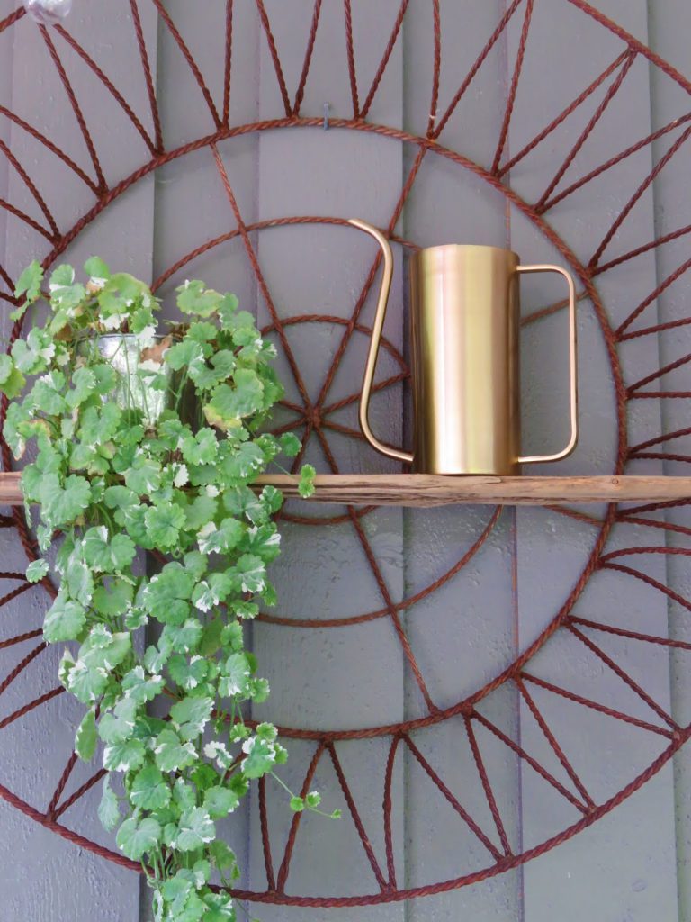 På terrassen hvor grillmåltidet og/eller kaffekosen inntas, har Signe Kari laget det koselig med flere stilleben. Denne runde, rustne saken er en av mine favoritter. Hun har rett og slett trædd en drivved-hylle inn i den runde anordningen. Genialt og utrolig sjarmerende. Ikke sant?