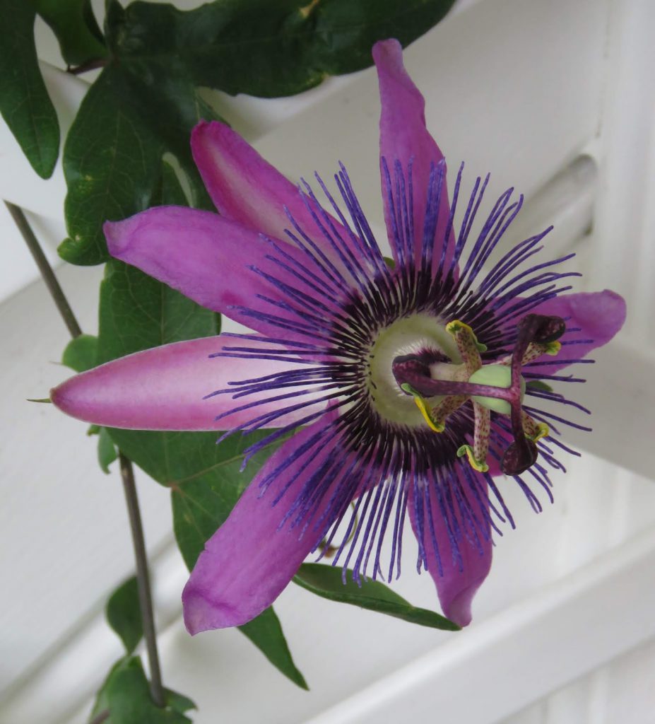 Nærbilde av en lilla pasjonsblomst. Hos Signe Kari og Vidar.