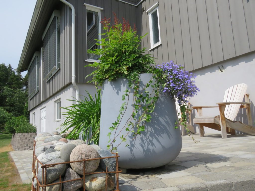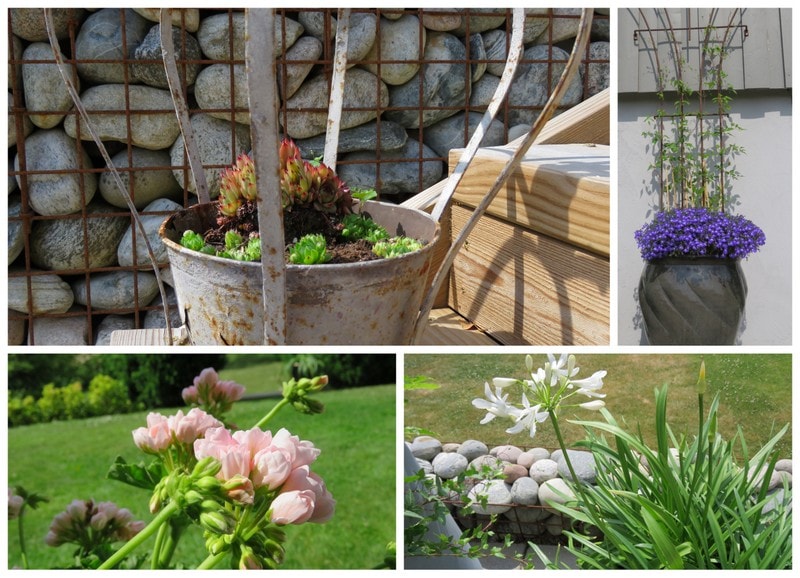 På hagevandring hos et vennepar i Fredrikstad - En sjarmerende uteplass med gabionmur og blomsterkrukker.