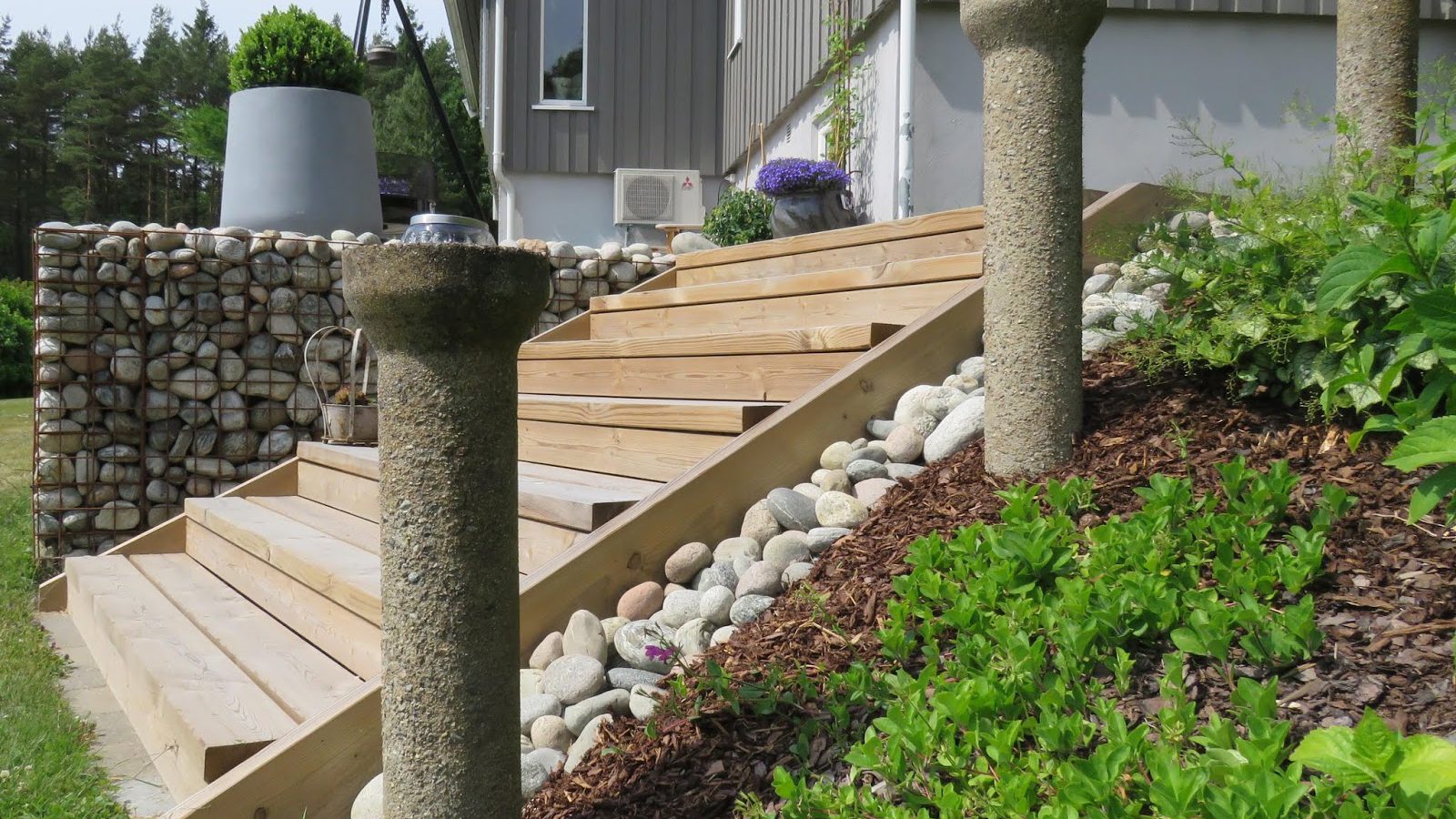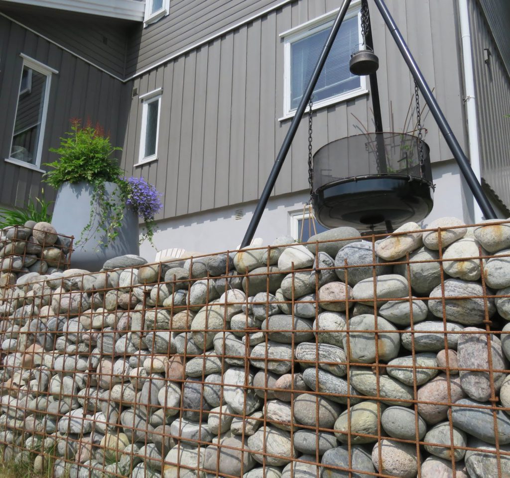 Gabion er en fin måte å lage en støttemur eller en hvilken som helst artig detalj i hagen. Den kan bestå av den steinen du liker best. Her er det brukt elvestein inni et bur/kasse av et holdbart materiale. Disse armeringsburene kan kjøpes ferdig, men Vidar har mekka disse sjæl. Snakk om!!