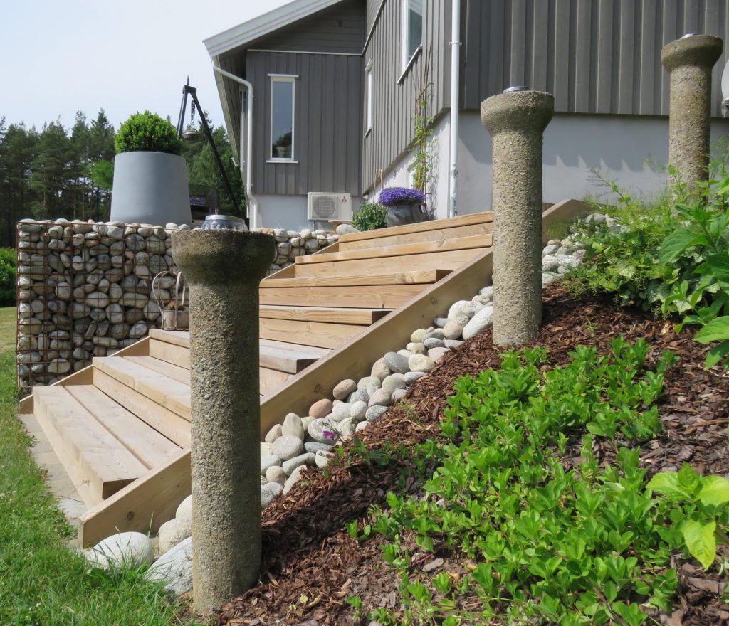 De sementrørene som Vidar har fastmontert i trappegangen opp til uteplassen. De brukes til små lykter som lyser opp denne flotte plassen.