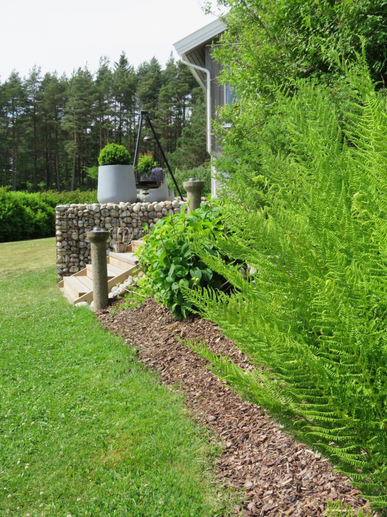 På hagevandring hos et vennepar i Fredrikstad - Praktisk og tøff gabionmur.