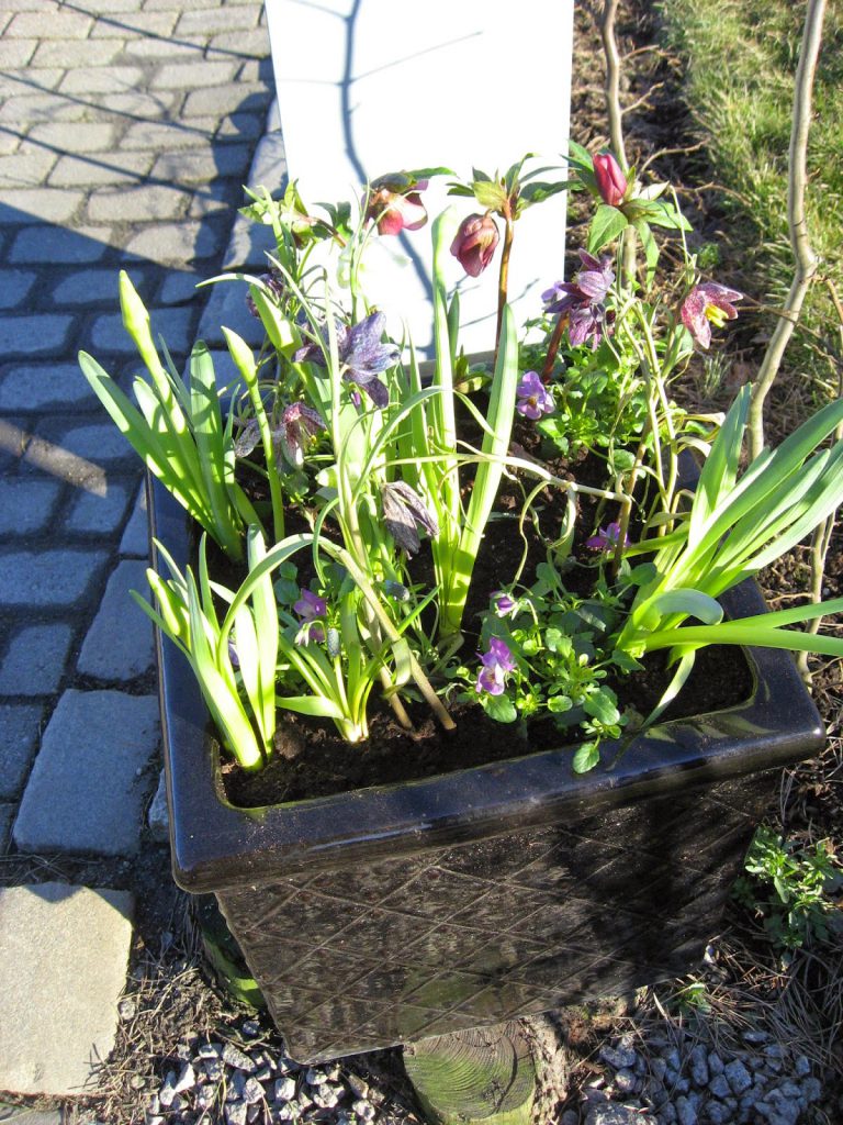 Jeg kjøpte også med noen ruteliljer – Fritillaria -, men jeg synes ikke de gjør seg så godt i krukkene.